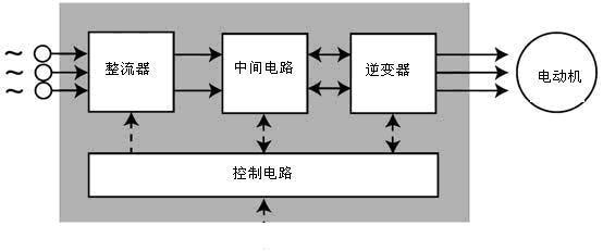 變頻器是把工頻電源(50Hz或60Hz)變換成各種頻率的交流電源,以實現電機的變速運行的設備。如圖1所示,其中控製電路完成對主電路的控製,整流電路將交流電變換成直流電,直流中間電路對整流電路的輸出進行平滑濾波,逆變電路將直流電再逆變成交流電。對於如矢量控製變頻器這種需要大量運算的變頻器來說,有時還需要一個進行轉矩計算的CPU以及一些相應的電路。