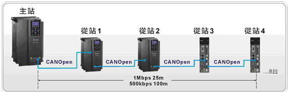 以往的變頻器是扮演純粹驅動的角色,接收上位機的命令做各種機械運動,C2000內建的PLC功能,同時支援CANopen通訊機能,當客戶有做兩台以上變頻器的應用時,隻需要透過一台C2000做主站,就可以實現最多同時/控製8台C2000或ASDA-A2伺服的應用,還可以利用分散式I/O的方式來控製遠程I/O節點,增加主機 I/O。