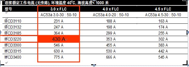 當起動電流倍數為3倍時,額定電機滿載電流430A,由此推算其額定輸出電流能力為: