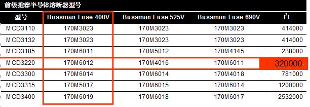 丹佛斯說明書中要求MCD3220前級安裝BUSSMANN的170M6012半導體熔斷器,要求的可控矽需要的短路保護I