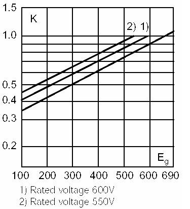 2t值為660V電網電壓時的數據,所以還要查表求出400V電網電壓時的修正係數,從下圖可以查到修正係數約為0.61。