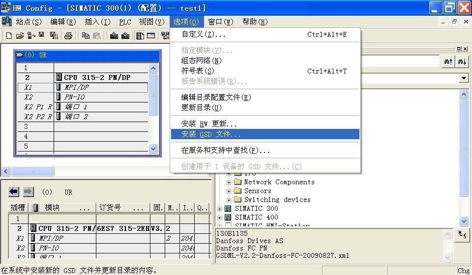使用 STMATIC STEP7 V5.5 組態軟件,進入硬件配置,將 MCA120 的 GSD 文件導入編程 環境中,點擊選項—安裝 GSD 文件,操作方式如圖。