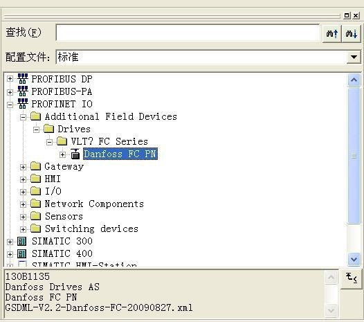 安裝成功後,可以在硬件目錄”PROFINET IO” — “Additional Field Devices” — “Drives” 欄下找到 Danfoss FC 係列變頻器,如右圖所示。