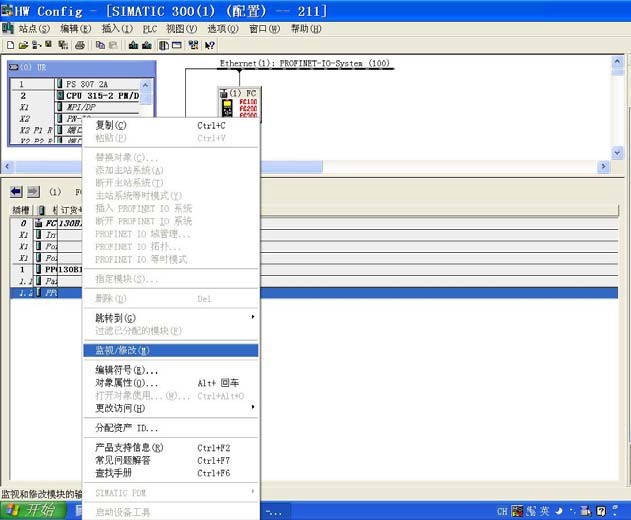 STEP7 硬件配置的 ONLINE 模式提供簡易的在線調試功能,可以操作現場變頻器, 檢查配置和接線是否正確。在 ONLINE 模式,PLC 運行狀態下,選中從站深夜福利免费的 圖標,再點擊從站的 1.2 插槽,示例中顯示為“PPO 4 – 6/6 Words,Danf~”模塊,按鼠標 右鍵,選擇“監視/修改(M)”。