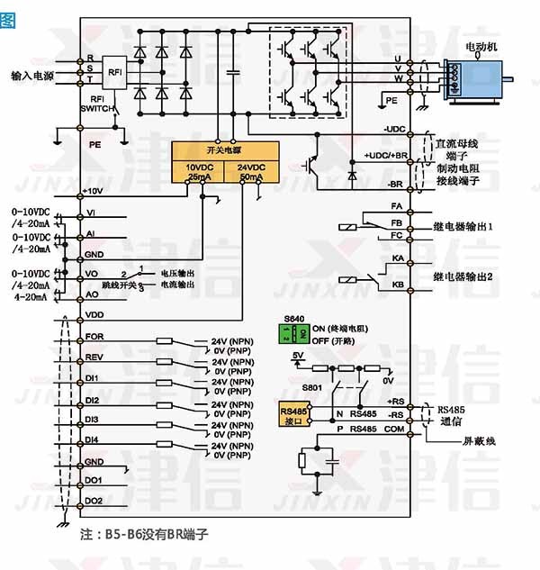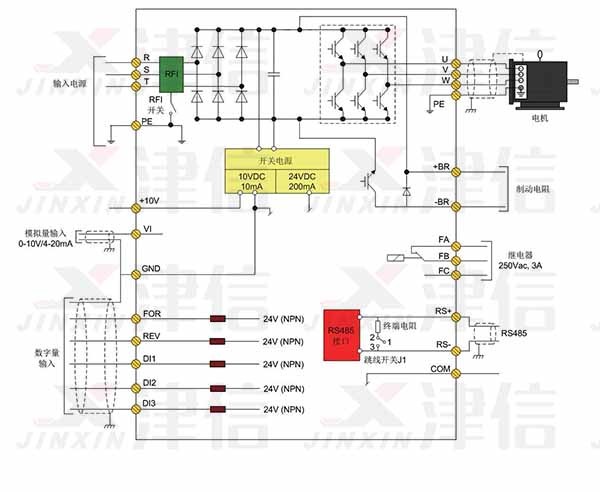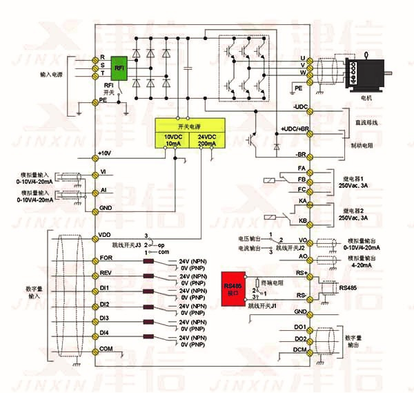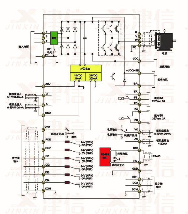 海利普變頻器主要由整流、濾波、逆變、驅動單元、製動單元、檢測單元微處理單元等組成。采用交-直-交工作原理,首先將三相交流電經整流模塊變換成直流,再進行濾波後,通過IGBT等其它電力電子器件逆變成頻率和電壓均可變的三相交流電供電機使用。同時,通過IGBT的開斷調整輸出電源的頻率和電壓,從而達到調速、節能的作用。以下是海利普各係列變頻器的接線示意圖。