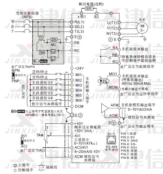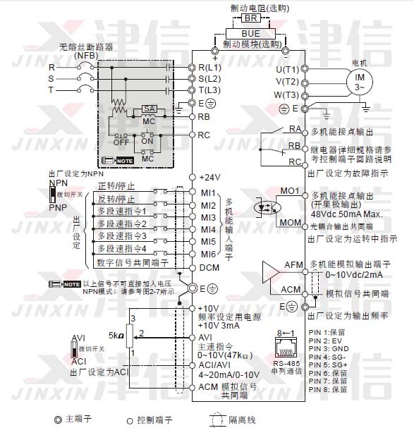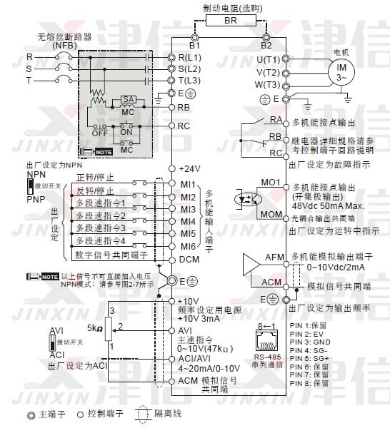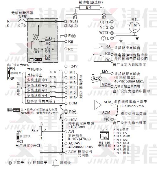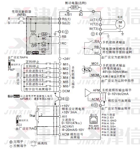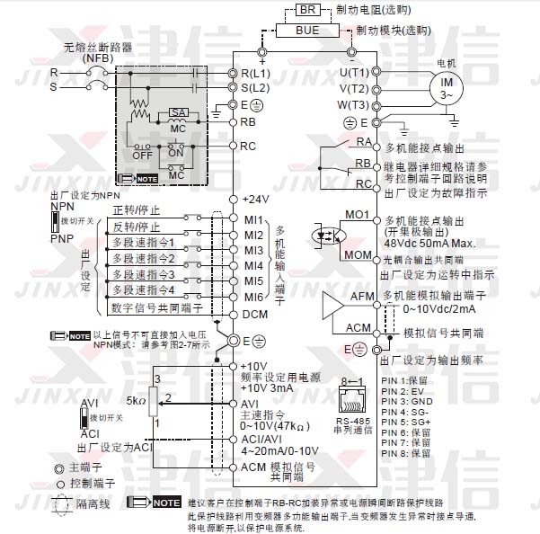 l 為了安全和減少噪聲,230V 係列采用第三種接地(E ),460V 係列采用特種