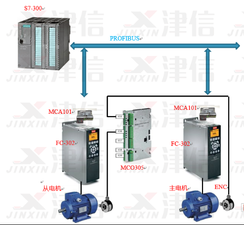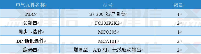 PLC與丹佛斯FC302變頻器之間進行PROFIBUS通訊,通過PLC可以設置同步功能、非同步功能、等工藝參數;FC302變頻器控製從機電機,以保證出標精度及響應精度。 變頻器通過MCO305運動控製卡,實現角度同步控製。MCO305運動控製卡內要編程,接收現場總線控製命令,發送各種狀態信號,實現各種控製,如單機運行/同步運行模式切換,判斷從機編碼器故障等。