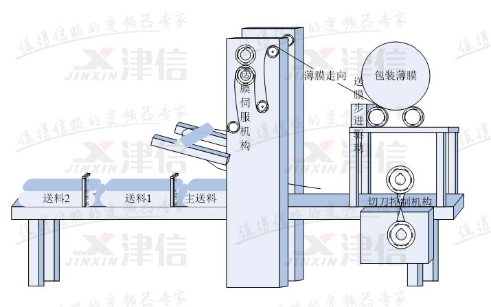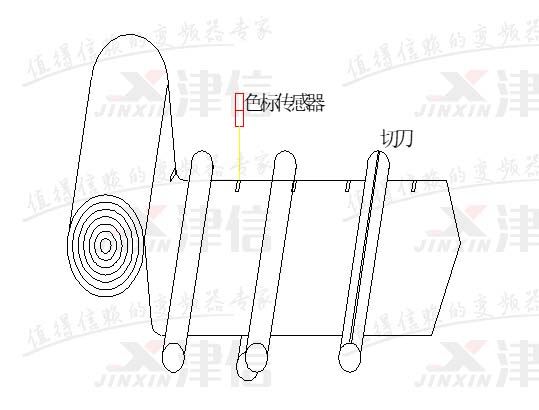 送膜控製有定長送膜和色標對標送膜兩種情況。定長送膜,隻需根據主軸編碼器信號,主軸轉一圈(輸送一個物料),送膜部分輸送一段固定長度的膜即可,不需動態調整;色標對標送膜,不但要求主軸轉一圈輸送一段固定長度的膜,還要求膜上的色標點正好落在主軸的設定相位點上,以使橫切刀能精確地切在色標點上。因此色標對標送膜還需要根據檢測到的實際色標相位差,在生產過程中動態調整送膜電機的相位。