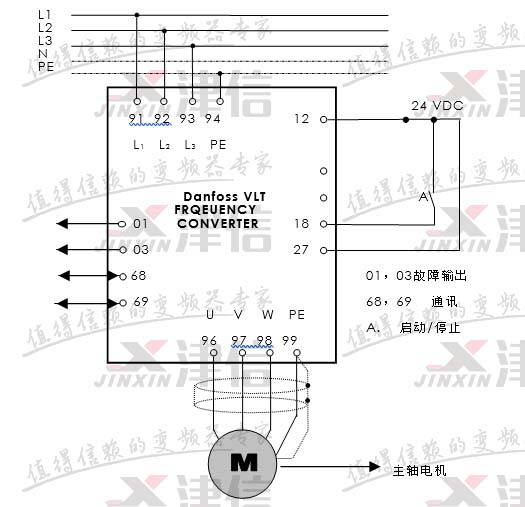 變頻器與主軸電機的係統組成及控製端子接線如圖所示: