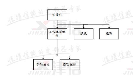 開機後,首先進行程序的初始化。初始化完成後同時調用工作模式選擇、報警和PLC與變頻器之間的通訊程序。工作模式中,包含手動出標、自動出標兩種狀態。報警程序用於對機器狀態進行實時監控,並根據故障情況執行相關動作。