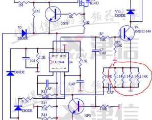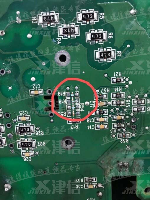 拆下電源卡,查看相關電路圖紙,測量發現開關電源部分的MOS管1MB12-140的E極回路上4個電流采樣電阻阻值不正常(如下圖1所示),4個采樣電阻阻值均為1.14歐姆,采用並聯方式連接,並聯後阻值為0.3歐姆,更換這些采樣電阻,上電顯示正常,故障修複。