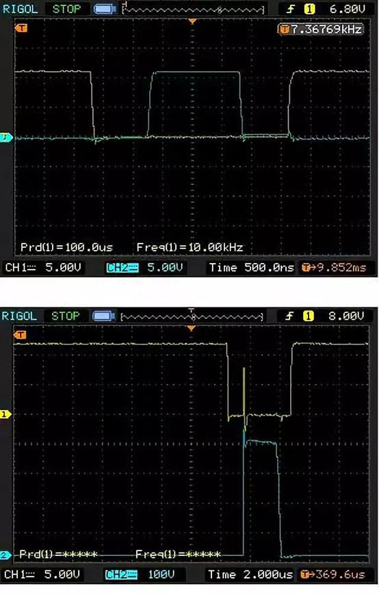 上麵的圖是在不加DC400V情況下測量2管G極波形,下圖是在DC400V情況下,2管的柵極波形。