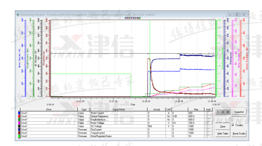 可以看出在高速狀態下,VaconNXP變頻器在高速應用的對電機震動影響不大,而其他品牌變頻器在高速應用時,會增加電機震動。高速應用在Vacon變頻器有完整的解決方案,NXP係列變頻器完全可以穩定應用在高速應用的場合,同時有良好的應用效果。