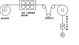 3,收卷:線速度同步+恒張力控製,有跳舞輪位置反饋,變頻器作閉環工藝控製,控製跳舞輪的位置。