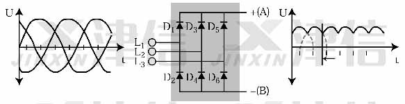 圖1是變頻器整流部分的結構及工作原理圖。變頻器通過三相整流橋將輸入側的三相交流電壓整流為帶有六脈衝尖峰的直流電壓。原來每一相的反相半個周期電壓疊加在正相電壓之上,因此在直流電壓上產生了周期為1/6正弦周期的脈衝波紋。