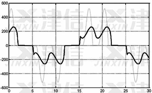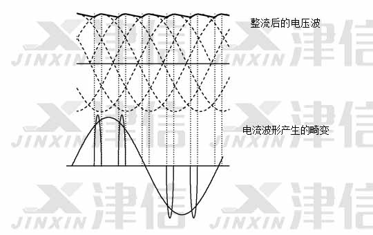圖2則表示出由於直流電壓上存在六脈衝的波紋,導致了電網會在每個電壓脈衝的尖峰時刻對變頻器直流儲能回路(主電容)進行充放電。因此導致了變頻器的輸入電流波形也產生了畸變。
