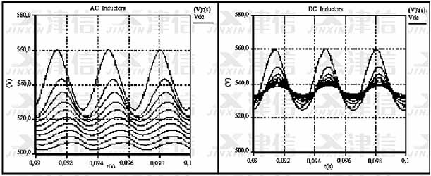 圖6中顯示的是加裝交流和直流電抗器對直流整流電壓的影響。從測量結果可以清晰看出加裝交流電抗器雖然對直流電壓上的高次諧波(520VDC以上)有明顯的抑製作用,但同時會造成直流側電壓的明顯損失。而直流電抗器在濾除高次諧波的同時對於直流電壓不會造成任何電壓損失