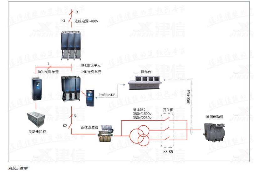 這個項目是Danfoss公司首次同天作電氣的合作項目;項目中采 用了以丹佛斯公司VACON® NX係列變頻器為電源核心的測試電源解決方案。單元+逆變單元+製動單元)、正弦濾波器、升壓變壓器、製動電阻以及輸出電壓切換開關構成。可以提供最高至2250V的正弦電壓輸出。天作電氣成櫃。另外包含測試操作台,以及為了滿足測試工藝而選用的各種傳感器,功率分析儀器等。