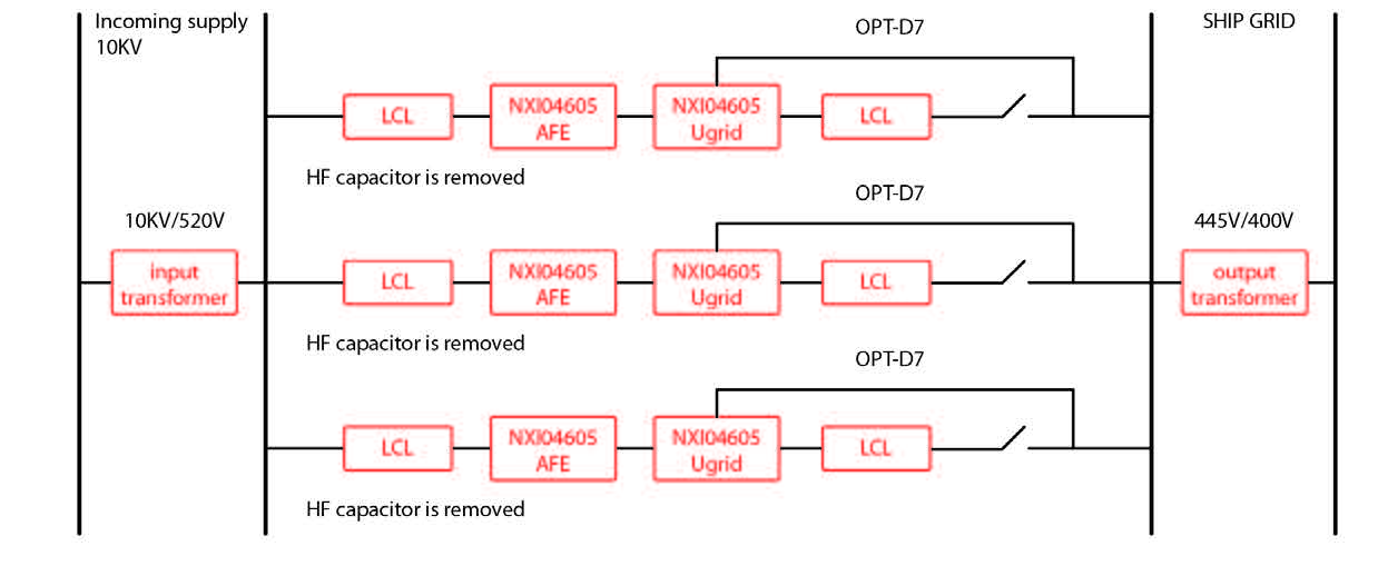 此項目並網電源采用VACON®NX係列共直流母線傳動產品, 含3台AFE整流裝置(310kW) 和3台並網變流器(310kW)。